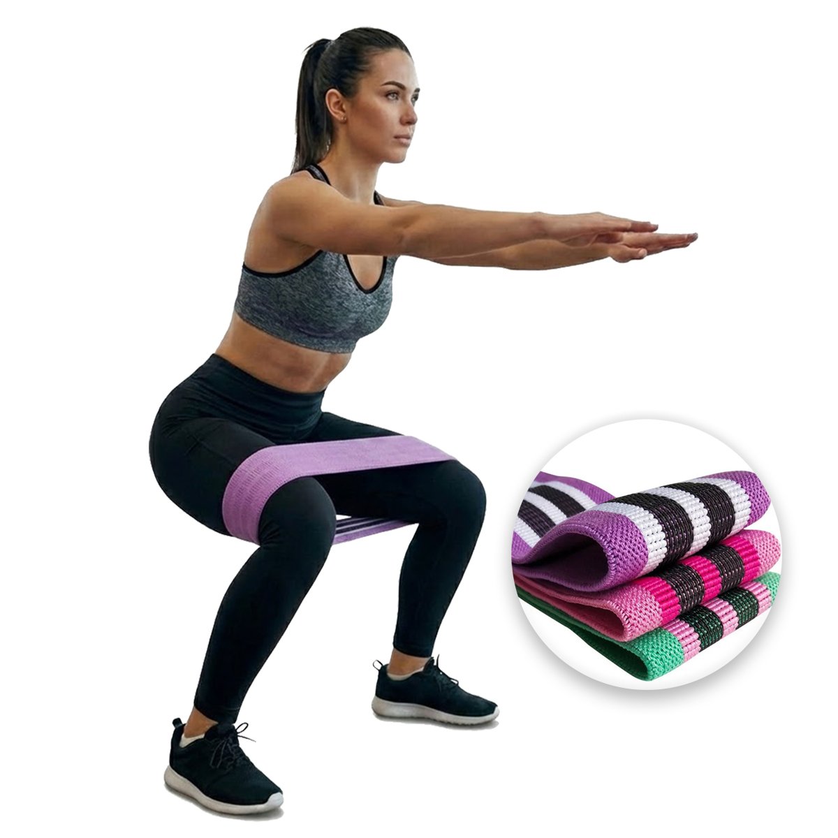 Kit de 3 bandas de resistencia de tela, ideal para entrenamiento de piernas y glúteos, tonificación general y trabajo de fuerza en casa o en el gimnasio.