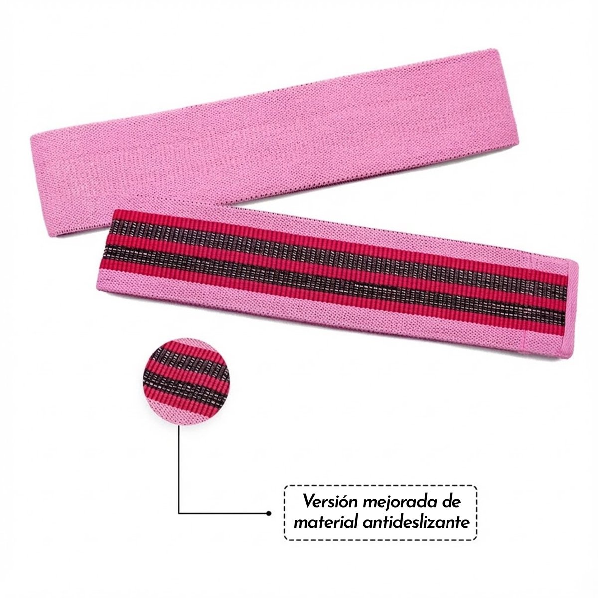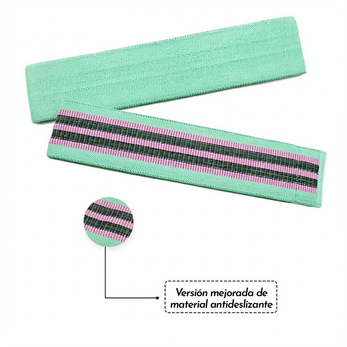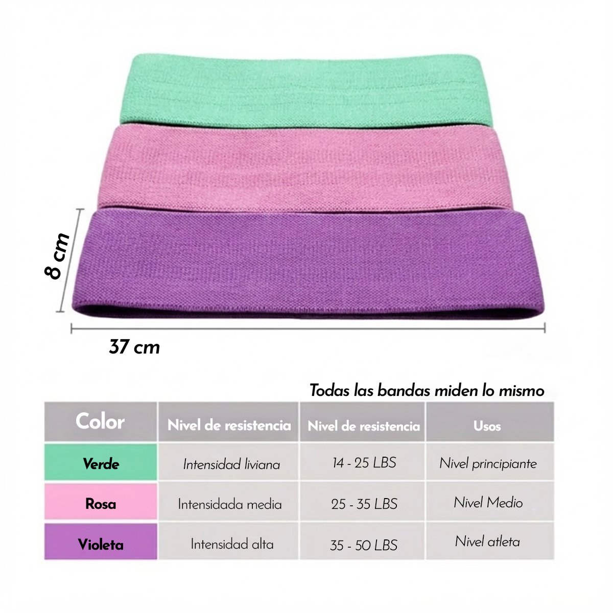 Este kit incluye 3 bandas circulares de tela con diferentes niveles de resistencia (baja, media y alta) para adaptar la intensidad de los ejercicios a cada usuario y progreso. Están confeccionadas en tela elástica reforzada con interior antideslizante, lo que evita que se enrollen o se deslicen durante el entrenamiento.